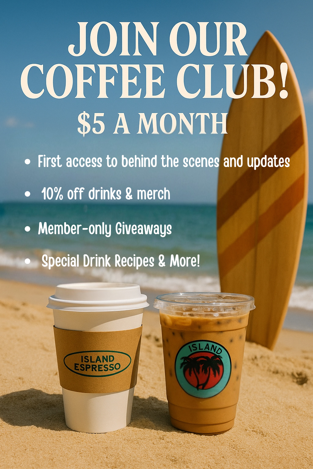 Love Island Espresso? Take it a step further by joining our Coffee Club : your all access pass to the heart of everything we’re brewing behind the scenes.